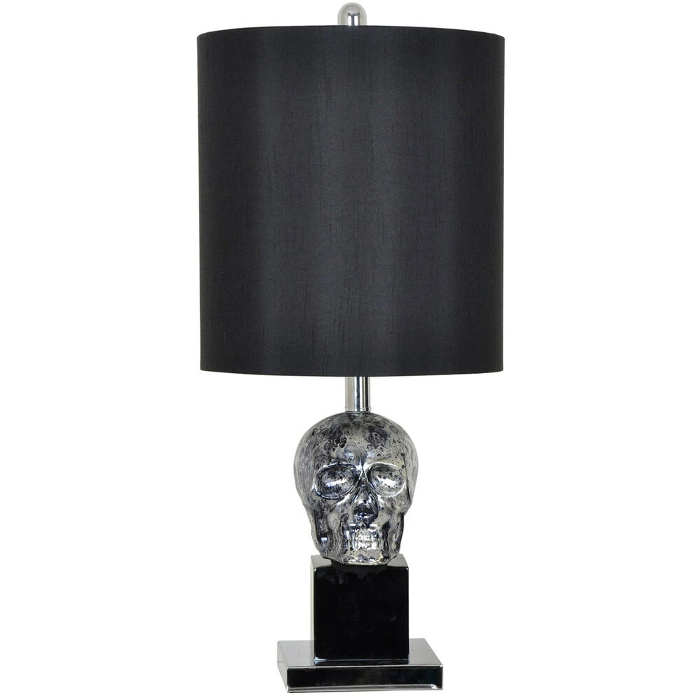 Black Skull Table Lamp27″ Ht., Glass & Resin & MetalBlack Mecury Finish12 x 12 x 13 Black Silk & Chrome Lining Shade