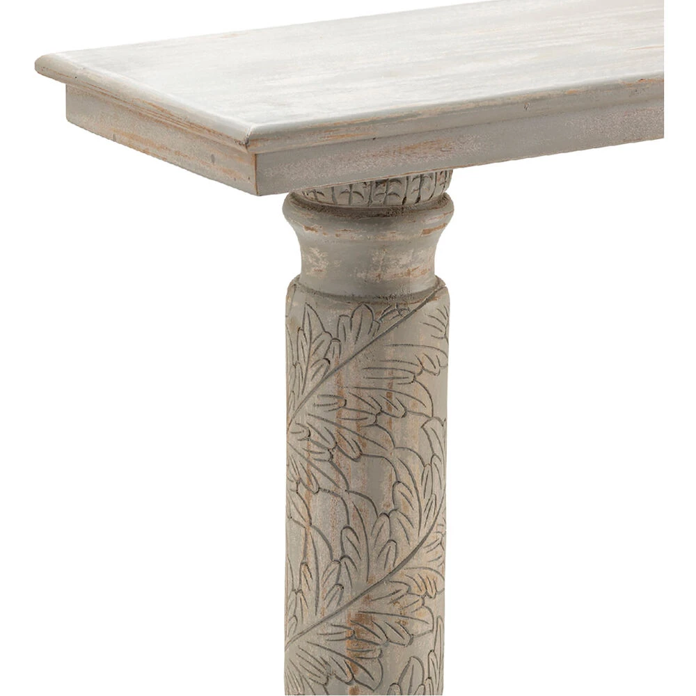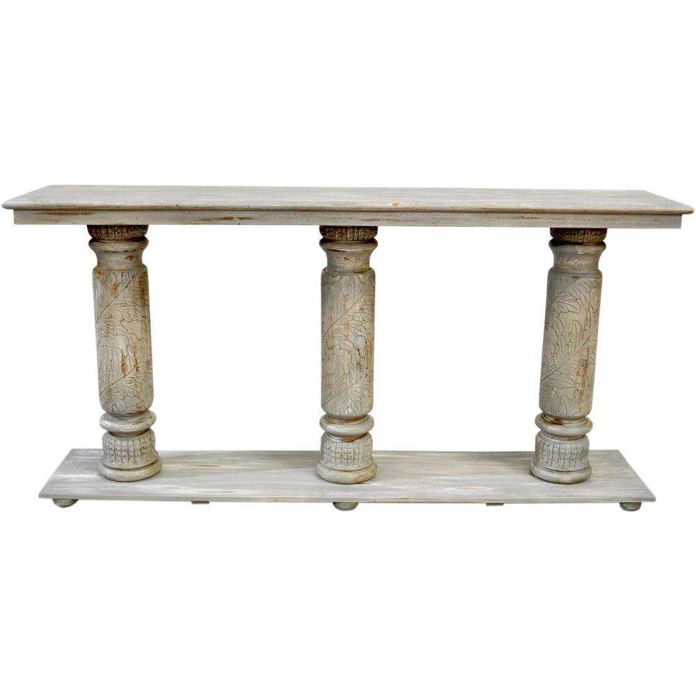 The Wood Console Table is 34.5 inches tall and features Light Gray coloring. The piece embodies a Rustic theme.