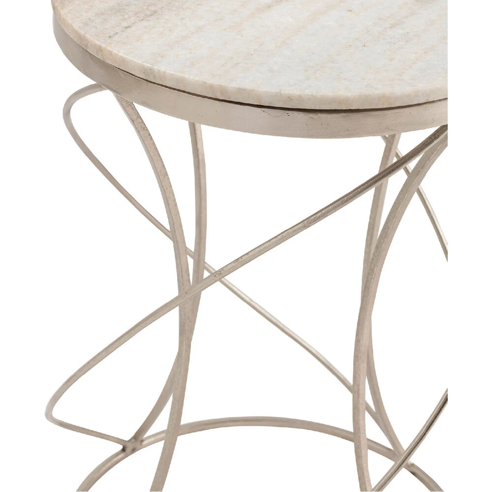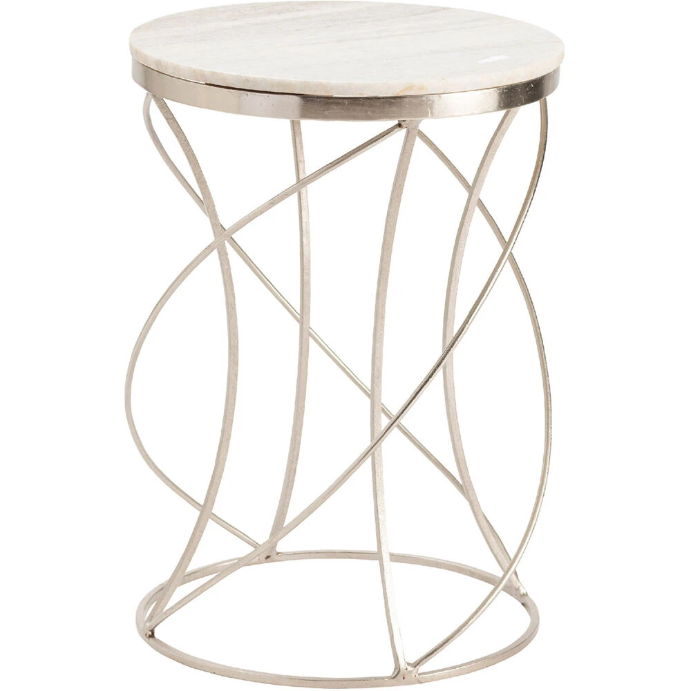 The Round End Table is 24 inches tall and features White/Silver coloring. The piece emobodies a Contemporary theme.