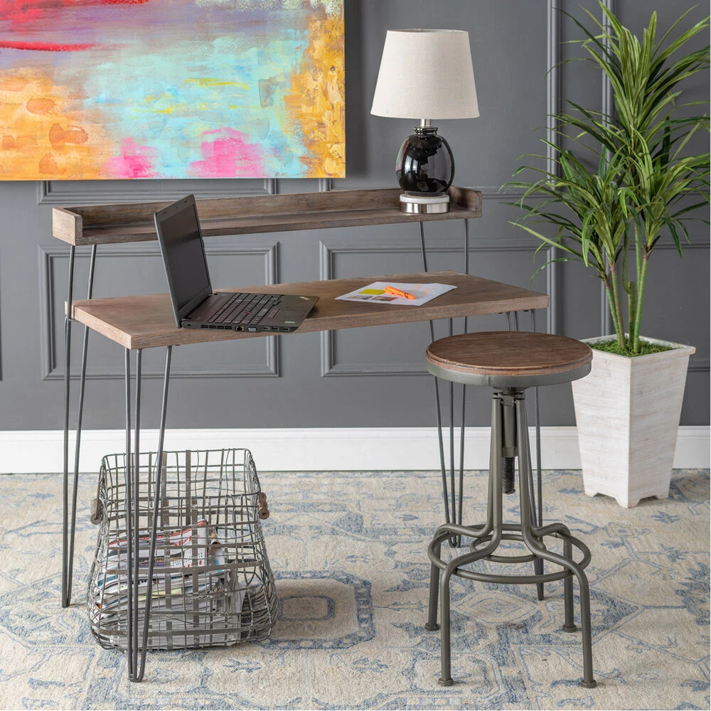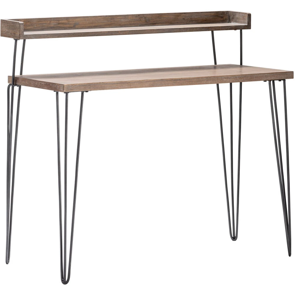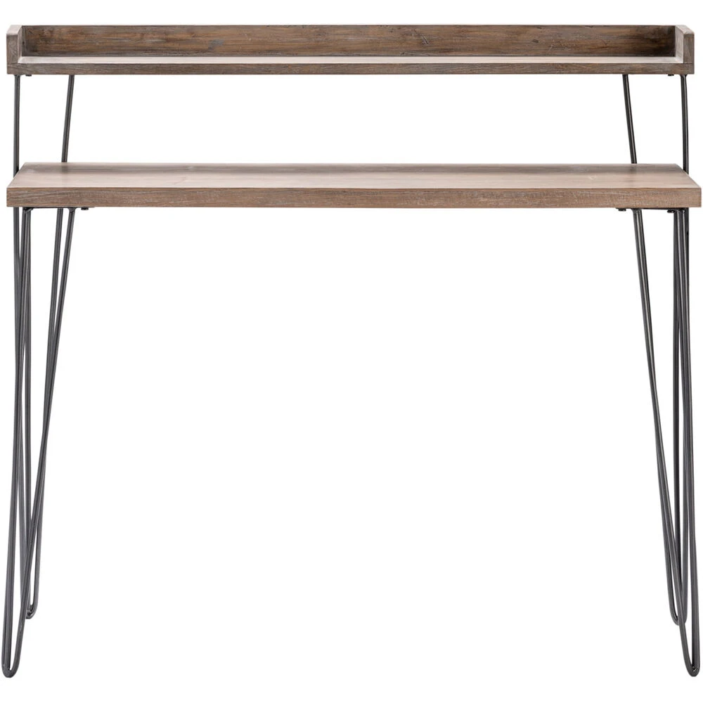 The Cody 2 Tier Wood and Metal Desk stands 39 in height, featuring Dark Brown/Black coloring. The piece embodies a Modern Theme.
