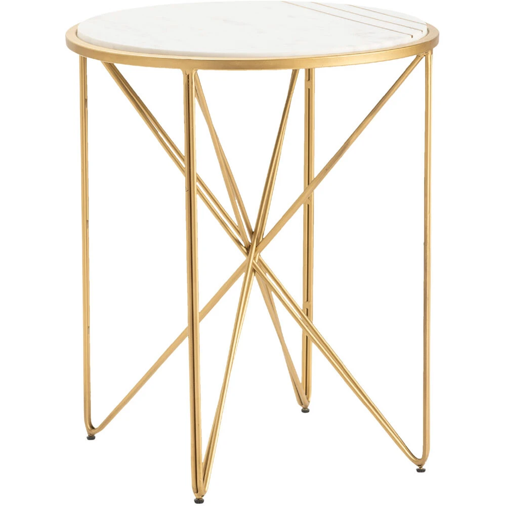 The White Marble Inley Top Side Table is 24 inches tall and features White/Gold coloring. The piece embodies a Modern theme.