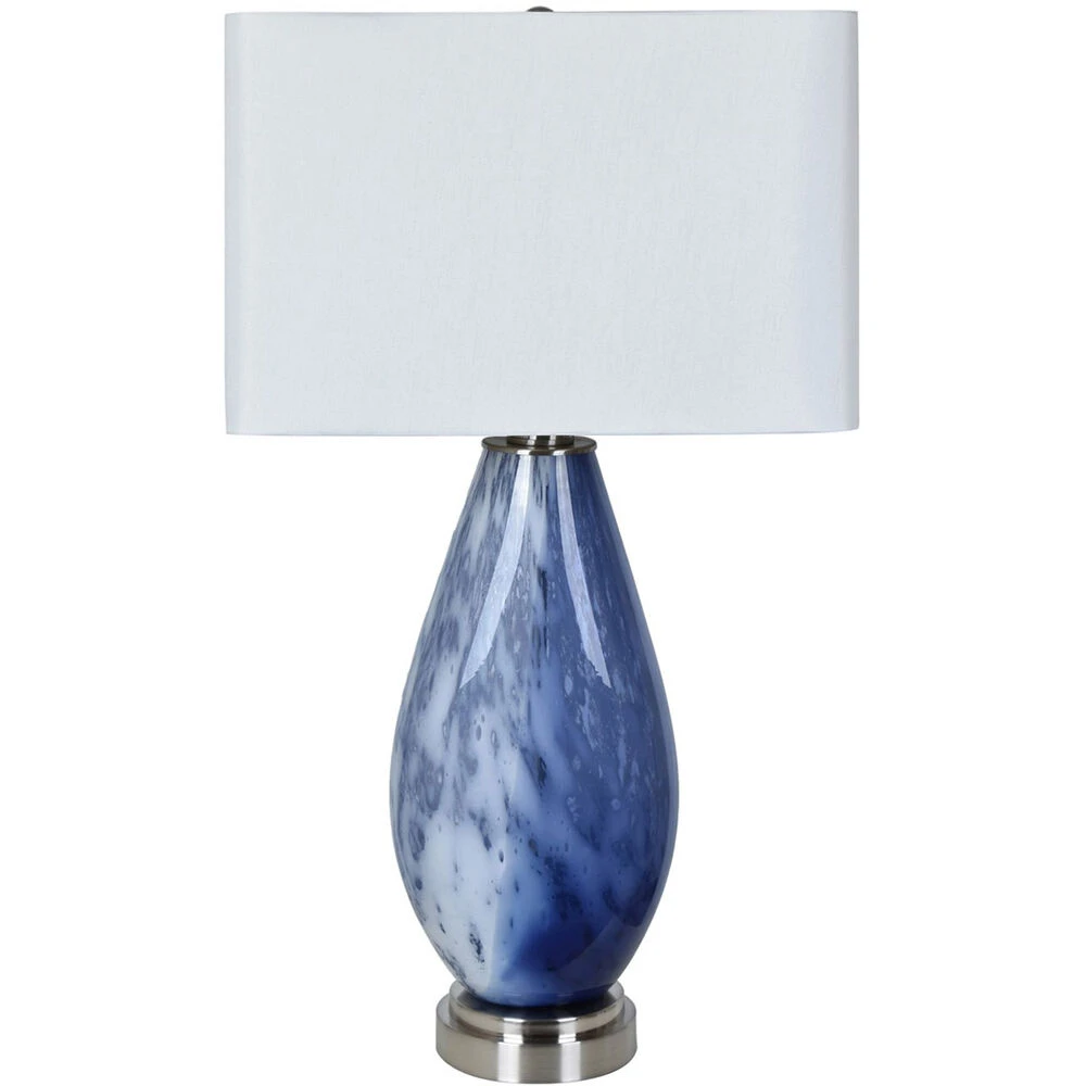 Emma Table Lamp 32.5″ Ht.,Glass&Metal Blue Reaction Glass&Brush Nickel Finish 18/10 x 18/10 x 12 White Silk Shade
