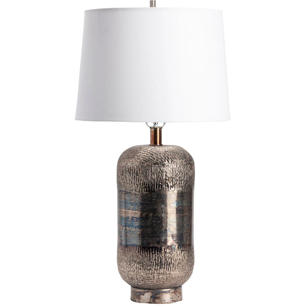 The Reynolds Table Lamp is 31.75 inches tall and features Grey/ Gold coloring. The piece embodies a Transitional theme.