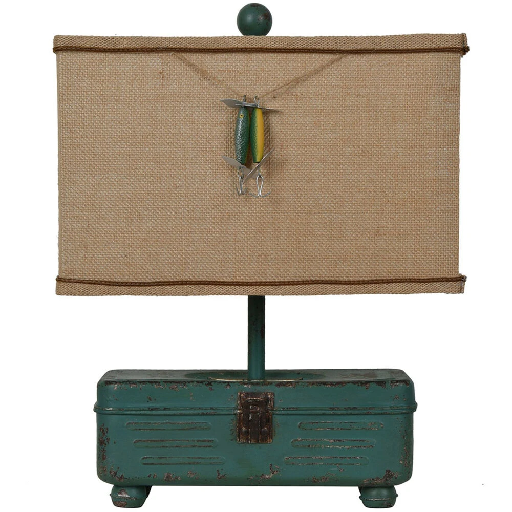 Tackle Box Table Lamp 18″ Ht.,Resin Vintage Tackle Finish 13.5/7.5 x 13.5/7.5 x 8.5 Burlap Shade